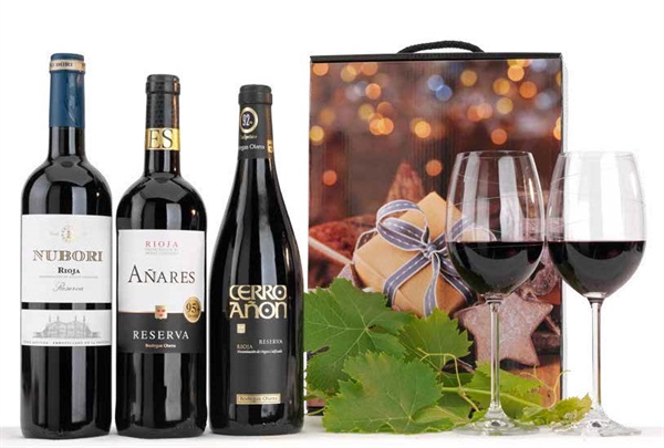 LICORES 1 Botella de Vino Tinto de Autor D.O. Rioja CERRO AÑÓN Reserva 1 Botella de Vino Tinto D.O. Rioja NUBORI Reserva 1 Botella de Vino Tinto D.O. Rioja AÑARES Reserva de BODEGAS OLARRA CONSERVAS Y OTROS 1 Caja de Cartón Selección con asa para 3 Botellas de Vino 15,76€ 19,07€ IVA INCL.